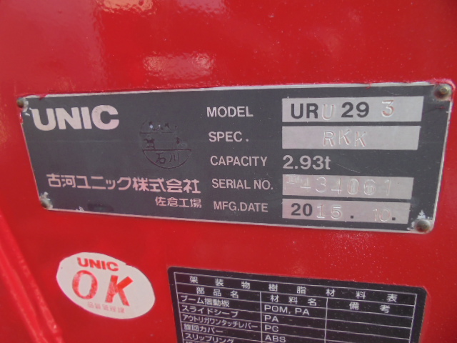 上物:ユニック製URU293 3段クレーンフックインラジコン最大吊り上げ荷重2.93t